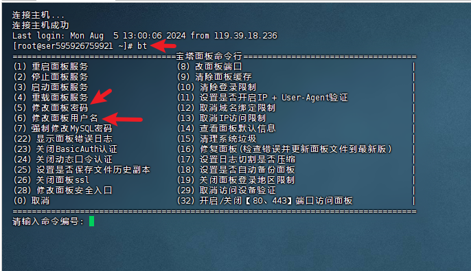如果您忘记了宝塔的账号密码导致无法登录,可以SSH连接服务器后输入bt指令并按回车随后便可以看见以下界面